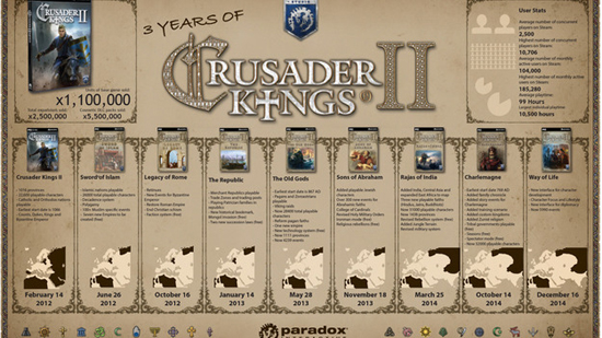 По статистике Paradox Interactive, опубликованной по случаю празднования Дня всех влюбленных и трехлетию Crusader Kings II, среднее время провождения за игрой составляет 99 часов. Другими словами, каждый, кто купил игру провел в ней в среднем 100 часов, что является высоким показателем для современных игр.