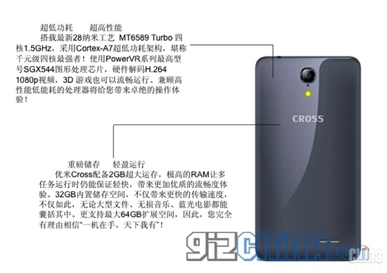 UMi Cross будет оснащен 6,44-дюймовым Full HD OGS дисплеем, 4-ядерным процессором МТ6589Т, 2 ГБ RAM, 32 ГБ ROM, слотом для карты памяти до 64 ГБ, 8 Мп фронтальной и 13 Мп задней камерой от Sony с датчиком Exmor RS и апертурой F2.0. Кроме того, смартфон может похвастаться внушительной емкостью аккумулятора на 4150 мАч. По словам производителя, в режиме ожидания UMi Cross способен проработать до 15 дней (350 часов).