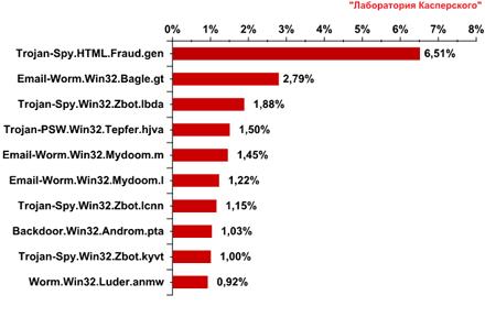 Наиболее популярной вредоносной программой в почте оказался, как и в предыдущем квартале, Trojan-Spy.HTML.Fraud.gen. Напомним, эта программа, выполненная в виде html-странички, имитирует регистрационную форму сервиса онлайн-банкинга. Она используется фишерами для хищения финансовой информации пользователей.