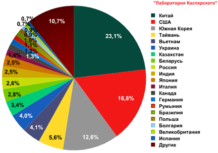 Лидеры среди стран-источников спама остались прежними, хотя доли рассылаемой ими мусорной почты немного уменьшились: это Китай (-1,2%), США (-0,9%) и Южная Корея (-3%). При этом в трех из бывших союзных республик — на Украине, в Казахстане и Белоруссии — резко увеличилась доля исходящего спама, из-за чего во втором квартале они попали на 6, 7 и 8 строчки соответственно, обогнав Россию, расположившуюся на 9 позиции.