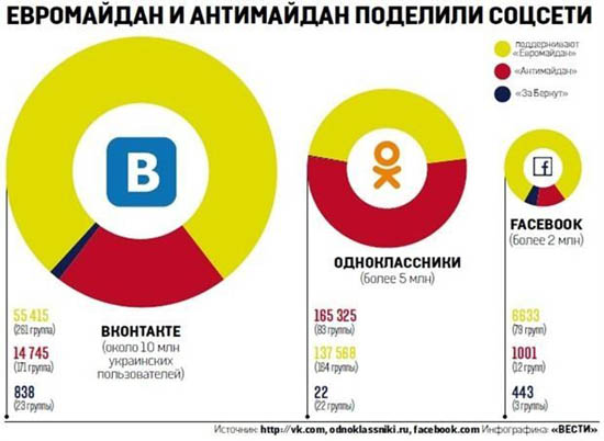 А вот "Одноклассники" четко антимайдановские – здесь самые активные борцы против евромайдановцев. "Они проводят рейды по соцсети и тролят странички ярых евромайдановцев. Здесь, пожалуй, с большей частотой размещают видео и фото в поддержку своих идей". Создатель Одноклассники.ru Альберт Попков считает, что просто в его соцсети люди постарше. "Они больше думают о последствиях митингов и ценят стабильность", – отметил Мишин.
