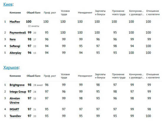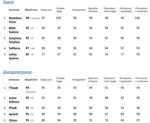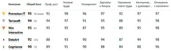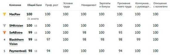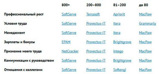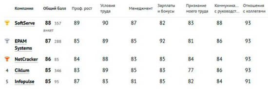 Наибольшее количество оценок в этой категории было сделано сотрудниками компаний Luxoft (377 анкет), SoftServe (351) и Ciklum (346).