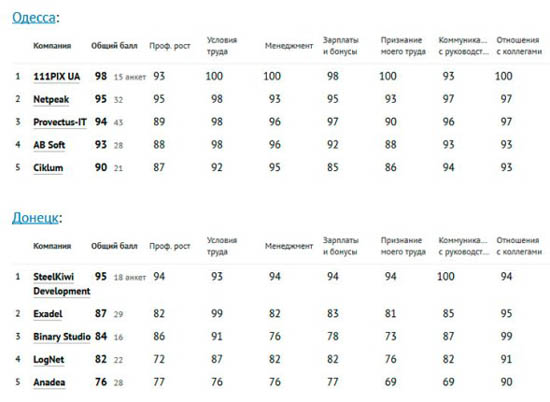 Рейтинг состоит из четырех категорий в зависимости от количества сотрудников. В каждой категории представлен топ-5 лучших IT-компаний. Также в DOU составили общую таблицу по всем категориям и отобрали региональных лидеров — лучшие компании Киева, Львова, Одессы, Харькова, Донецка и Днепропетровска.