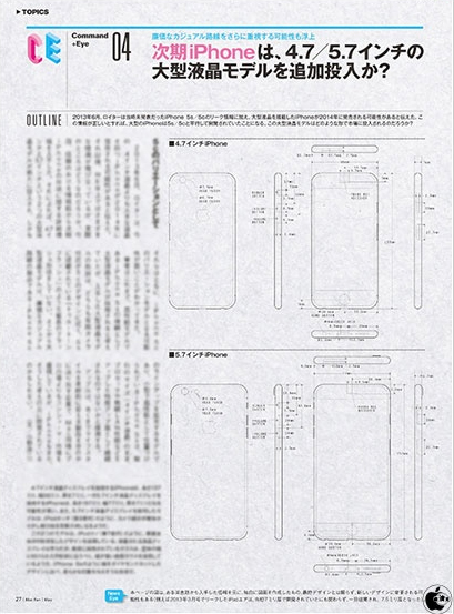 Судя по слухам и отчетам аналитиков в этом году компания Apple изменит привычный подход к смартфонам и выпустит сразу два устройства. Что важно, это будет не топовый смартфон и прошлогодний гаджет в пластиковом корпусе, а две трубки, отличающиеся размерами экрана. Информаторы сошлись во мнении, что один получит дисплей с диагональю 4.7 дюйма, лицевую сторону второго украсит огромная панель с 5.5 дюймами расстояния между противоположными углами. Известный японский журнал MacFan зашел дальше других — журналистам удалось заполучить чертежи, пары новых смартфонов, которые попали в свежий номер.