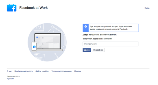 Газета «Известия» опубликовала скриншоты и первые подробности бизнес-версии Facebook – социальной сети Facebook at Work. По данным издания, функционал корпоративной социальной сети будет отличаться от Facebook тем, что там не будет доступа к игровым приложениям. Для пользования Facebook at Work нужно будет зарегистрировать отдельный профиль с именем, фамилией и фотографией, возможность импортировать свои данные из Facebook не предусмотрена. Каждому сотруднику компании будет выдаваться специальных логин и пароль для входа, под надписью «Facebook» можно будет разместить корпоративный логотип.