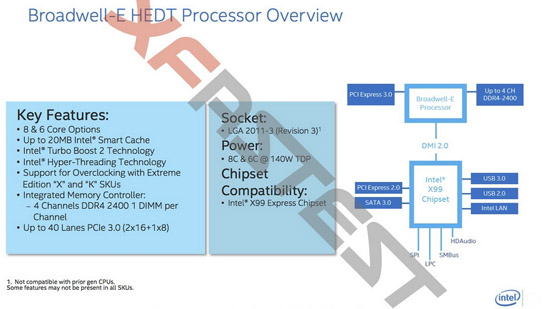 Вернёмся к платформе Broadwell-E. Как уже было сказано, соответствующие процессоры получат до 8 ядер, по крайней мере, старшая модель, Core i7-6960X. Младшая модель, как и в случае с Haswell-E, будет шестиядерной. Новая платформа HEDT обещает существенный прирост производительности по сравнению с 22-нанометровой Haswell-E, а также поддержку набора инструкций AVX 2.0. К радости энтузиастов, новые процессоры сохранят совместимость с имеющимся процессорным разъёмом LGA 2011-3 и будут обслуживаться хорошо знакомым нашим читателям чипсетом Intel X99 Wellsburg. Максимум, что может потребоваться — обновление BIOS системной платы. Теплопакет Broadwell-E будет достигать 140 ватт, а объём кеша составит до 20 Мбайт. Разумеется, чипы X и K сохранят разблокированный множитель и поддержку памяти DDR4 на частоте 2400 МГц (без разгона контроллера). Максимальное количество линий PCI Express 3.0 останется прежним — 40. Будет ли оно усечено в младшей версии Broadwell-E, к сожалению, не известно.