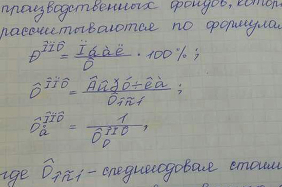 Недоумение преподавателя вызвали странные символы, которые девушка использовала для записи формул. В реферате, написанном от руки на тетрадном листке в клетку, все русские слова были написаны правильно, а в формулах девушка использовала непонятные знаки.