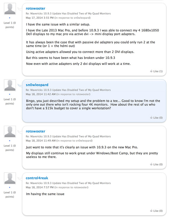 Установка на рабочие станции Mac Pro последнего поколения OS X Mavericks 10.9.3 приводит к проблемам в работе с мониторами, несмотря на то, что улучшенная работа с внешними дисплеями была одной из целей, преследуемых Apple при выпуске обновления. Жалобы появились на официальном форуме техподдержки Apple.