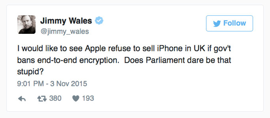 Джимми Уэльс, запустивший в 2011 году онлайн-энциклопедию, назвал британский законопроект «глупым». «Хотел бы я видеть, как Apple прекращает продажи iPhone в Великобритании после того, как правительство решит запретить сквозное шифрование, – написал разработчик в своем микроблоге Twitter. – Неужели парламент будет настолько глупым?»