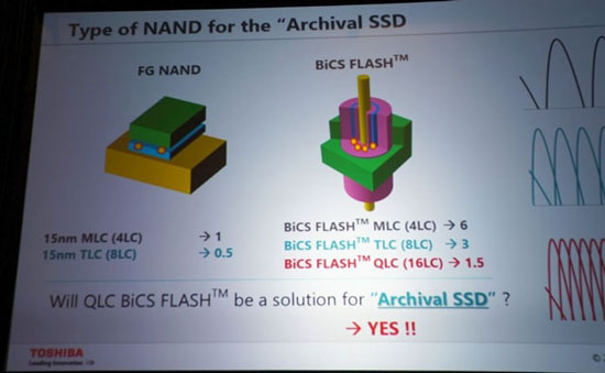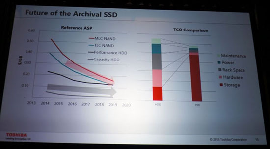 Учитывая тенденцию снижения стоимости хранения данных на жёстких дисках и на разных типах памяти, в компании Toshiba уверены, что со временем хранение данных на SSD будет стоить дешевле, чем на HDD. Выше вы можете видеть график, из которого следует общая выгода хранения данных на твёрдотельных накопителях. Сопутствующие затраты в пересчёте на объём SSD и HDD просто несравнимы. В совокупной стоимости владения на долю ёмкости HDD приходится порядка 25 % вложений, тогда как в случае SSD — более 75 %. Безусловно, в ближайшем будущем — до 2020 года — SSD не смогут заменить жёсткие диски во всём спектре применения, но 3D NAND и четырёхбитовая ячейка обещают открыть путь к недорогим и ёмким SSD для хранения архивных данных.