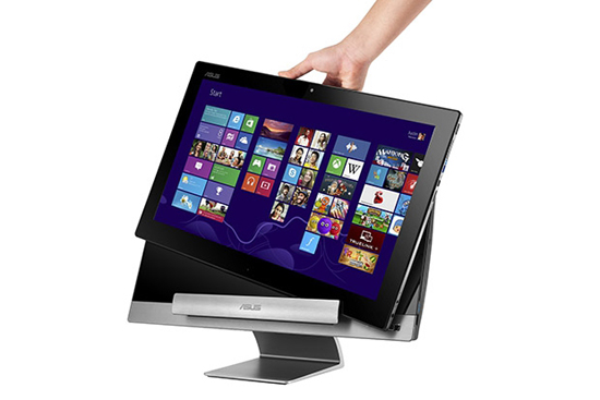 Если Lenovo предлагают убирать подставку моноблока внутрь него, то в Asus — снимать экран моноблока с подставки. Результат получается тоньше и легче Lenovo IdeaCentre Horizon Tour (тем более что диагональ экрана здесь 18’’ вместо 27’’), но остается слишком громоздким, чтобы рядовой пользователь постоянно носил его по квартире: скорее это оценят дизайнеры, которым хотелось бы иногда положить сенсорный экран на стол и нарисовать на нем что-то от руки.