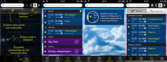 Загрузив эту программу в Apple Store, пассажиры и встречающие могут не привязываться к информационным табло в аэропорту. В частности, пассажиру, который подписался на свой рейс, данные о начале посадки и номере выхода придут в виде сообщения на смартфон. Не выходя из мобильного приложения, можно заказать машину из службы Sky Taxi или забронировать номер в гостинице аэропорта.