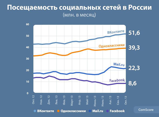 По данным ComScore, на которые ссылается Дуров, в октябре 2013 года посещаемость Facebook в России составила 8,6 млн. пользователей против 51,6 млн. у ВКонтакте.