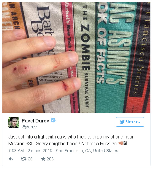 «Только что ввязался в драку с парнями, которые пытались украсть мой телефон недалеко от улицы Мишн, 980 (Mission — улица в Сан-Франциско — прим. «Ленты.ру»). Страшный район? Не для русского», — написал он. К сообщению о драке основатель «ВКонтакте» приложил фото своей пораненной руки.