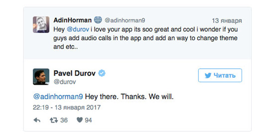 Отвечая на просьбу одного из пользователей добавить голосовые звонки и возможность изменить тему в мессенджере, Дуров ответил «Мы сделаем». Какой-либо точной информации о планах он не предоставил.