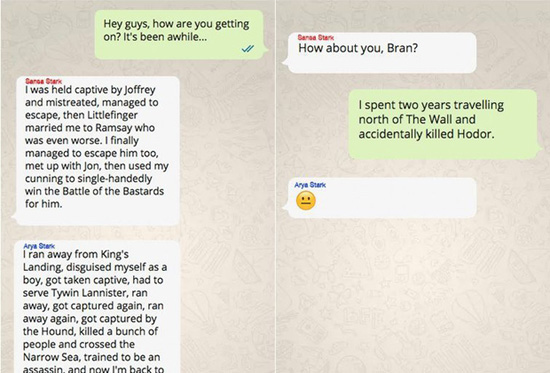 По мнению издания, дети Эддарда Старка создали бы чат в WhatsApp под названием «Зима близко». Санса Старк рассказала бы про то, что попала в плен к Джоффри, а после бегства ее насильно женили на Рамси Болтоне. В итоге с ее помощью Джон победил в Битве Бастардов. Арья Старк поведала бы о бегстве из Королевской Гавани, нахождении в плену у Тайвина Ланнистера и превращении в Ассасина. Бран же удивил бы всех новостью о том, что он случайно убил Ходора.
