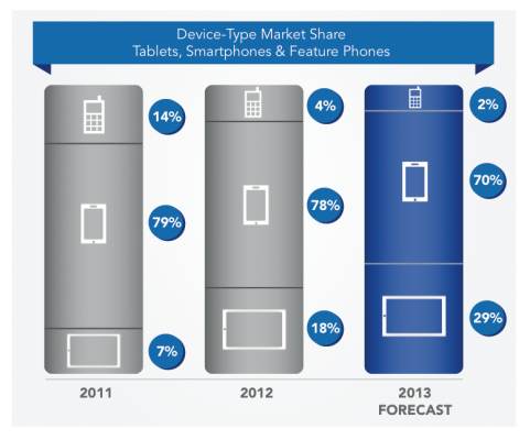 Все больше людей выходит в интернет с мобильных устройств. Ожидается, что популярность планшетов и количество проданных устройств в 2013 году окажется рекордно высокой — на их долю будет приходиться треть трафика. Если быть точным, 29.5 процентов доли мобильного интернета достанется планшетам, 70% — смартфонам, а доля обычных «звонилок» составит менее 2%.