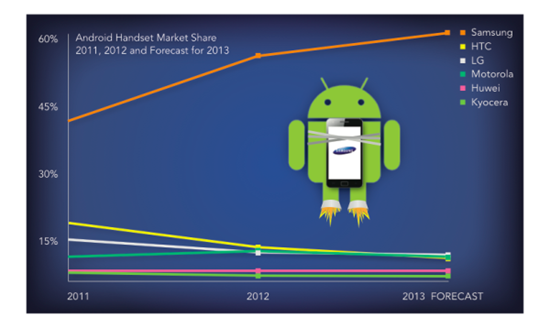 Если говорить о производителях смартфонов под управлением Android, на коне окажется Samsung. Год от года они занимают все большую часть рынка, чего нельзя сказать о других производителях.