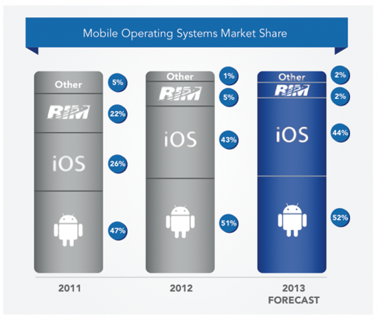 Изменения коснутся также распределения позиций между операционными системами. В противостоянии iOS и Android сохранится равновесие, а вот судьба RIM, недавно переименовавшейся в Blackberry, может быть не столь безоблачной. По прогнозам они могут потерять до трех процентов рынка, отдав свою часть Apple, Google и другим производителям.