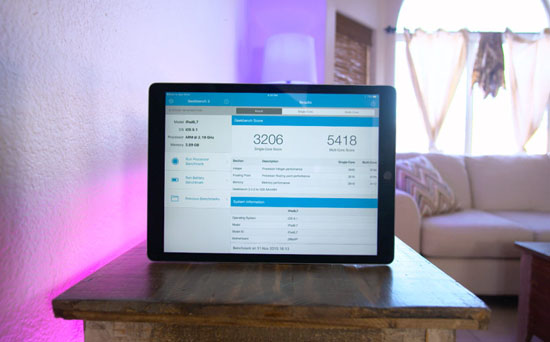 Планшет iPad Pro работает на самом мощном процессоре среди всех iOS-устройств — 64-разрядном A9X разработки Apple и сопроцессоре M9. Тест Geekbench 3, разработанный для оценки производительности основного процессора, показал превосходство iPad Pro перед Air 2 на 24% в многоядерном тесте и на 88% — в одноядерном. В тесте 3DMark Ice Storm Unlimited, который измеряет производительность в играх и при воспроизведении видео в высоком качестве, iPad Pro показал на 54% более высокое быстродействие, чем 10-дюймовый флагманский планшет.