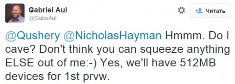Недавно опубликованные скриншоты сборок Windows 10 Technical Preview для телефонов выглядят впечатляюще. Однако до сих пор оставалось вопросом, смогут ли владельцы бюджетных девайсов на Windows Phone, на которых предусмотрено всего 512 МБ оперативной памяти, также получить обновление системы, как и обладатели топовых смартфонов. Теперь Габриэль Аул, руководитель Windows Insider Program, подтвердил через Twitter, что телефоны с 512 МБ памяти получат первое превью системы.