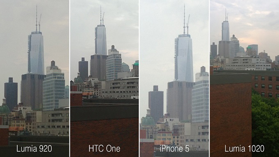Специалисты с сайта Gizmodo.com устроили смартфону небольшое сравнение с Lumia 920, HTC One и iPhone 5. Nokia Lumia 1020, естественно, оставила всех позади. По широте динамического диапазона к камере 1020 максимально приблизился HTC One, однако низкое разрешение его ультрапиксельной камеры и плохая детализация при максимальном увеличении выводят Lumia 1020 в лидеры. То же самое касается и цветопередачи. Apple iPhone 5 и HTC One изрядно перенасыщают картинку, в то время как 1020 снимает более естественно. Вердикт: лучший камерафон с отличным экраном, который, объединив в себе две сущности, не выглядит чудовищем. Из минусов: невысокая скорость фотосъёмки и сохранения кадров, нехватка приложений, цена.