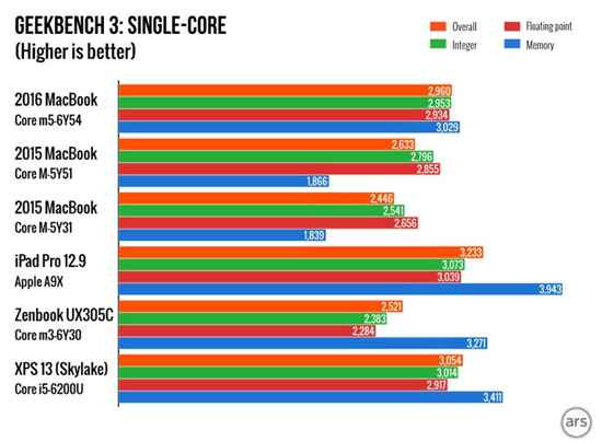 Эндрю Каннингем из Ars Technica считает, что MacBook 2016 года огорчит пользователей, которые ждали дополнительных интерфейсных разъемов. У ноутбука всего один коннектор USB-C для зарядки и подключения периферии и 3,5-мм аудиоразъем для наушников. Тем, кто воздержался от покупки оригинального устройства, обновленная версия MacBook может показаться интересной благодаря более быстрому накопителю, полагает Каннингем. Обозреватель провел множество синтетических тестов, проверив производительность нового MacBook.