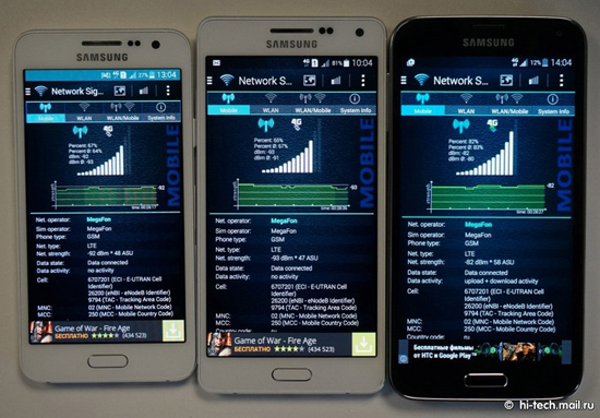 В одних и тех же условиях Galaxy S5 показывает -82 dBm, то есть мобильная передача данных работает стабильно, с небольшими потерями, тогда как Galaxy A3 и Galaxy A5 показывают -92 dBm и -93 dBm соответственно, что говорит о приеме сигнала чуть ниже среднего с заметными потерями пакетов.