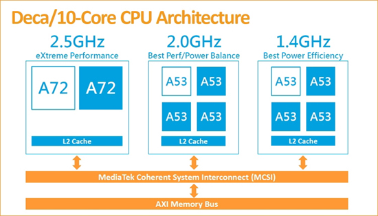 Напомним, что изделие Helio X20 — это первый мобильный процессор, насчитывающий десять вычислительных ядер. Конфигурация чипа предусматривает использование трёхкластерной архитектуры. Один из блоков объединяет два мощных ядра Cortex-A72 с частотой до 2,5 ГГц, два других — по четыре ядра Cortex-A53 с частотой 1,4 и 2,0 ГГц. Кроме того, есть ядро-компаньон Cortex-M4 с частотой до 364 МГц, предназначенное для обработки информации от датчиков и поддержки нетребовательных приложений. Графическая составляющая базируется на контроллере ARM серии Mali T800.