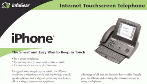 Представленный Стивом Джобсом в 2007 году iPhone не был первым гаджетом с таким названием - задолго до этого компания Infogear начала выпускать свои телефонные аппараты под аналогичным наименованием. История началась в 1998 году, когда был выпущен телефон, оснащённый сенсорным дисплеем, клиентом электронной почты и практически полноценным браузером. Впоследствии компания Infogear была поглощена Cisco, и к последней перешли авторские права на название iPhone.