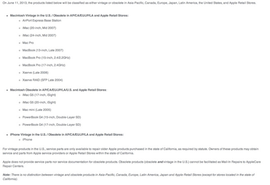 В соответствии с внутренней классификацией Apple, к «винтажным» продуктам относятся устройства, произведенные более пяти, но менее семи лет назад. Гаджеты же, которые вышли более семи лет назад, считаются «устаревшими». В прессу попал внутренний документ Apple, в котором перечисляются продукты, обреченные на то, чтобы кануть в Лету. Помимо оригинального iPhone, туда также входят такие устройства, как iMac, XServe, MacBook Pro и Mac Pro, вышедшие в 2008 году и раньше.