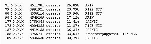 Вот список блоков, откуда пришло больше всего ответов («понгов»): ответили более 22% адресов.