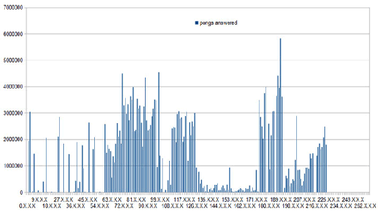 После 10 часов работы были получены следующие результаты: на пинг ответили 284 401 158 адресов, то есть около 7% всех систем. Если сгруппировать результаты по блокам /8, то процент ответивших систем сильно отличается в каждом из них. Во многих отклик 0,00%, например, в блоках 3.X.X.X, 6.X.X.X, 9.X.X.X и 11.X.X.X, которые принадлежат компании General Electric Company, армии США, компании IBM и Министерству обороны США, соответственно. В других же блоках наблюдается очень высокая активность.