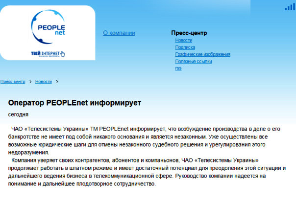 Ряд новостных изданий сегодня "разразился сенсацией". ее суть в том, что якобы "Хозяйственный суд Киева 27 мая начал банкротство оператора услуг мобильной связи стандарта CDMA «Телесистемы Украины» (бренд PEOPLEnet)."