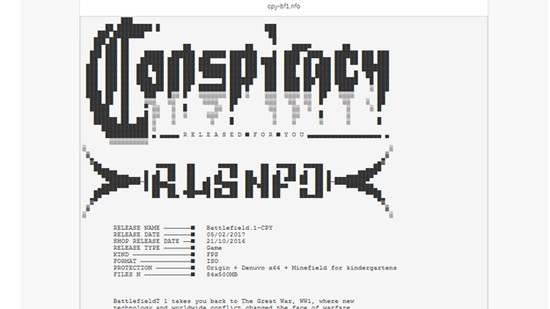 Информация о взломанной версии появилась на Reddit 5 февраля. На этот раз хакерам из группировки Conspiracy пришлось достаточно повозиться, ведь игра Battlefield 1 не только включает известную своей надежностью защиту Denuvo Anti-Tamper, но и привязана к электронному магазину от компании Electronic Arts — Origin.
