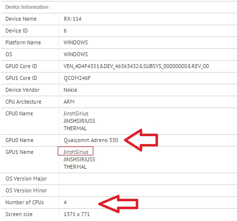 В результатах тестирования GFX указано, что планшет Nokia Windows RT (Sirius) основан на четырехъядерном процессоре Qualcomm Snapdragon 800 с графическим ускорителем Adreno 330.