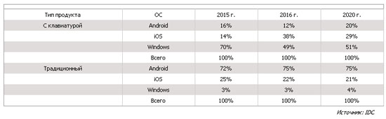 Наконец, iOS продолжит сокращать свою долю в сегменте традиционных устройств. В то же время доля iOS в сегменте клавиатур с планшетами вырастет с 14% в 2015 г. до 38% в 2016 г., но впоследствии снизится до 29%.