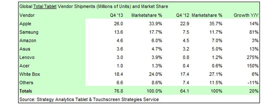 За весь 2013 года iPad удалось захватить 32,7-процентную рыночную долю (реализовано 74,2 млн единиц), тогда как позиции Galaxy-планшетов охвачены 18,3% (отпущено 41,7 млн устройств).