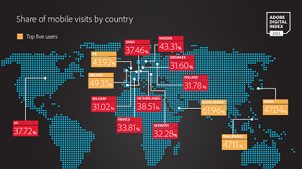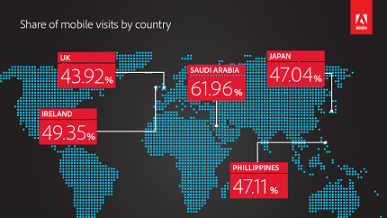 В Саудовской Аравии популярность мобильных устройств для выхода в сеть растет взрывными темпами. В начале года в Интернет на мобильные устройства приходилось 49% выходов в сеть, а к концу года этот показатель составит уже 61,9%. Вместе с данными о 25%-ном сокращении доли планшетов в формировании трафика становится понятно, что смартфоны обладают огромной популярностью. В Японии и Филиппинах больше 47% случаев выхода в Интернет также приходятся на мобильные устройства. В Европе огромный вклад в рост мобильного трафика делают Чехия и Словакия, у которых наибольший рост мобильного трафика - 43,5% и 40% соответственно.