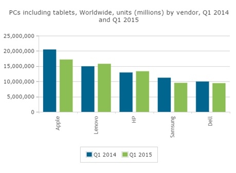 Крупнейшим производителем традиционных компьютеров и планшетов вместе взятых остаётся Apple, чья доля на данном рынке составила 15 % в прошлой четверти. За этот период американская корпорация выпустила 17,2 млн устройств, что на 16 % меньше в сравнении с первым кварталом 2014 года.