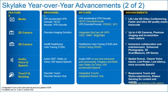 Компьютеры на платформе Skylake могут комплектоваться четырьмя HD-камерами. Кроме того, упомянута поддержка Wi-Fi 802.11ас, Bluetooth 4.1, Cat. 6 LTE, WiDi 6.0, WiGig, eMMC 5.0 и SDXC 3.0.