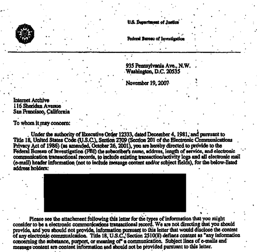 Например, в США слежка со стороны спецслужб осуществляется с помощью так называемых запросов NSL (National Security Letter) — без судебных процедур и запросов в прокуратуру. Спецслужбы могут начать начать проработку любого пользователя, по своему желанию, без всяких юридических процедур, в соответствии с законом USA PATRIOT Act. Пару дней назад один из судов признал NSL противоречащими конституции, и полномочия таких документов на 90 дней приостановлены, но практика снова может возобновиться после апелляции. Фонд электронных рубежей безуспешно сражается с NSL с 2005 года.