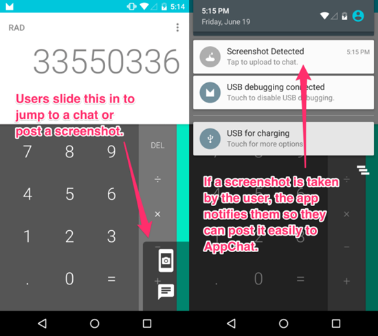 2.Когда пользователь делает скриншот, AppChat определяет это и предлагает сразу отправить его в нужный чат.