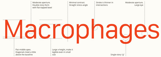 Одним из аспектов San Francisco эксперт назвал «увеличенное на вертикали начертание». Строчные буквы составляют около 75% от прописных – больше, чем у большинства других шрифтов. «Глаз» в буквах, таких как «е» или «а» – расстояние между хвостом и остальной частью – больше, чем в обычных шрифтах. Эти особенности начертания повышают «читабельность» текста даже при малой величине кегля.