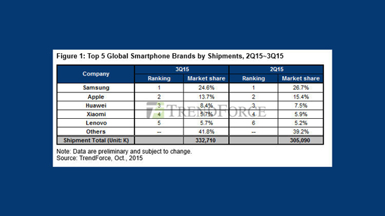 В данной таблице от TrendForce приведены первые пять вендоров смартфонов на мировом рынке с указанием доли рынка (Market Share) в процентах и места, занимаемого компанией в рейтинге по показателю поставок (Ranking) по состоянию на третий (3Q15) и второй (2Q15) кварталы 2015 года. В нижней итоговой строке (Shipment Total) приведены показатели поставок смартфонов на мировой рынок в тысячах единиц за указанные кварталы. В строке «Others» приведена доля рынка, приходящаяся совокупно на других вендоров, не вошедших в первую пятерку. Отраженные в таблице данные предварительны и могут меняться