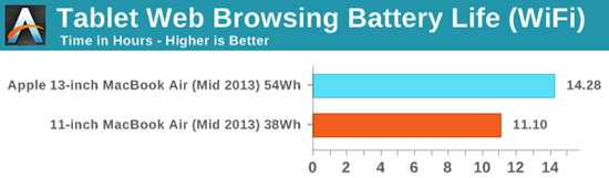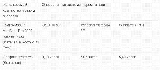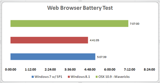 Ноутбук MacBook Pro 2012 года выпуска с обновленной Mac OS X Mavericks (самая свежая версия) продержался в режиме веб-серфинга свыше 7 часов. Это примерно на 2 часа (или 29%) больше, чем позволила Windows 7 (примерно 5 часов) или Windows 8.1 (4 часа 41 минута).