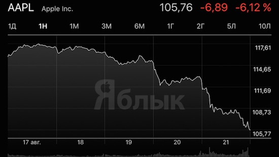 Слабенький подъем стоимости ценных бумаг компании, наблюдавшийся на прошлой неделе, на этой сменился срывом в крутое пике. Из-за снижения курса акций со $117 до $105 за единицу Apple уже лишилась $120 млрд. и предпосылок для изменения ситуации, на первый взгляд, немного.