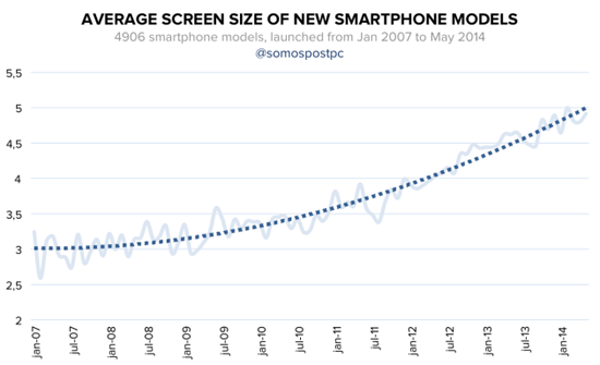 Пользователям Android не чужды большие смартфоны: флагман Google — Nexus 5 имеет дисплей с диагональю 4,9 дюйма, у флагмана Samsung, Galaxy S5 — 5,1 дюйма. В Азии, смартфоны с дисплеями более 5 дюймов являются самым быстрорастущим сегментом мобильного рынка и подавляющее большинство потребителей предпочитают большие телефоны.