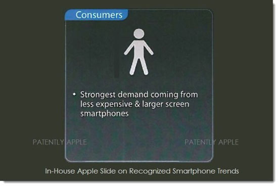 Кажется маловероятным, чтобы Джобс одобрил 4,7-дюймовый iPhone, не говоря уже о 5,5-дюймовом. Однако, сейчас во главе Apple — Тим Кук и он, вероятно, понимает, что нужно рынку сейчас: чем больше, тем лучше. На самом же деле, Apple уже давно всё понимает. Примером этого может послужить просочившийся в сеть слайд с презентации для внутреннего пользования, с указанием того, что компания осознает важность роста в этом направлении.