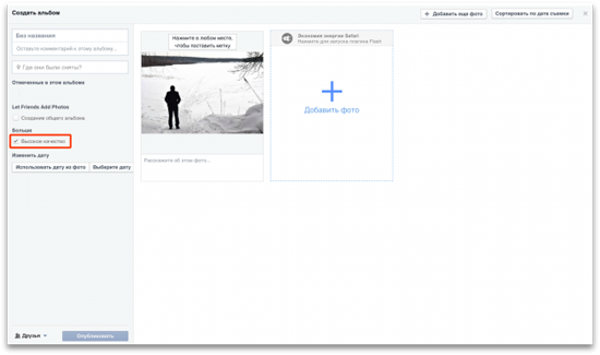 -Создавайте альбомы в высоком качестве. При загрузке фото в Facebook ставьте галочку «Высокое качество». Она позволяет хранить изображения большего размера с меньшим сжатием.